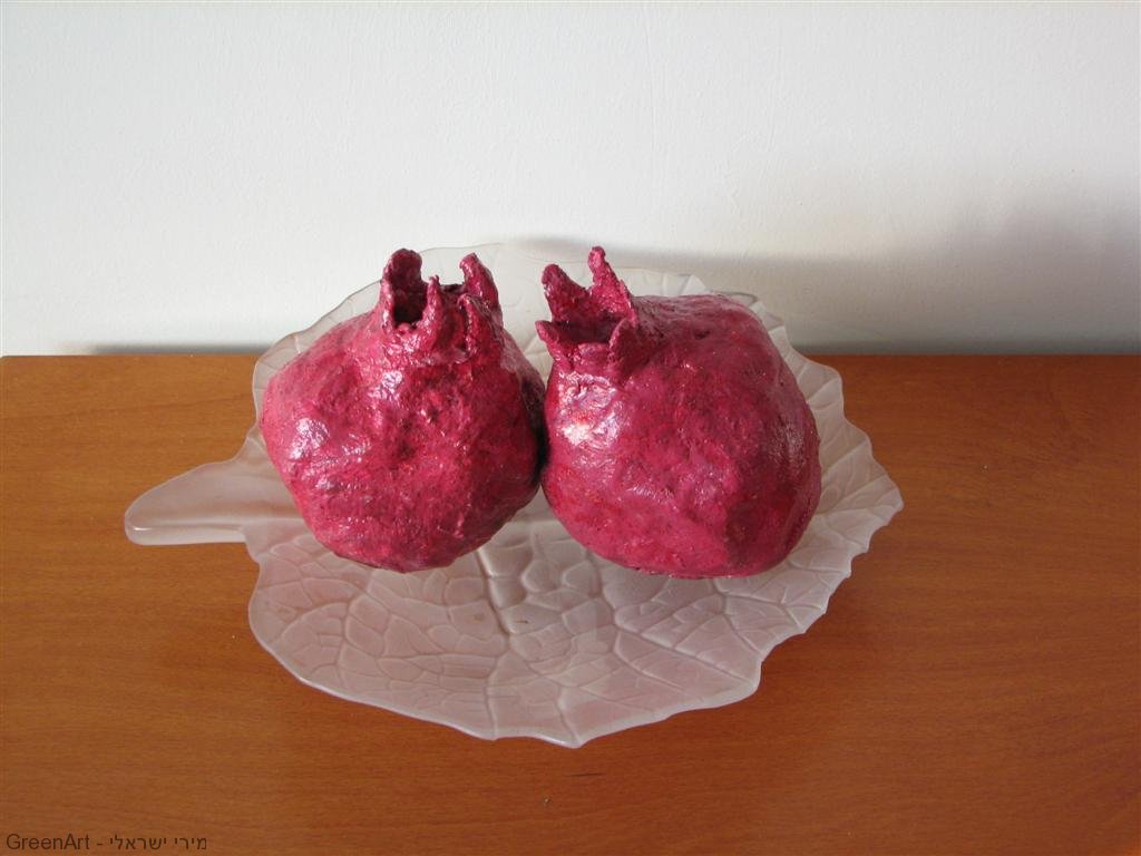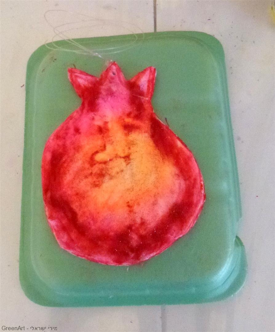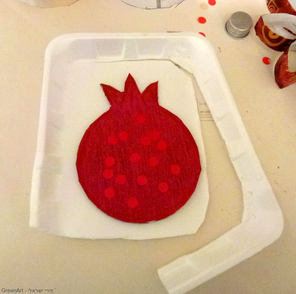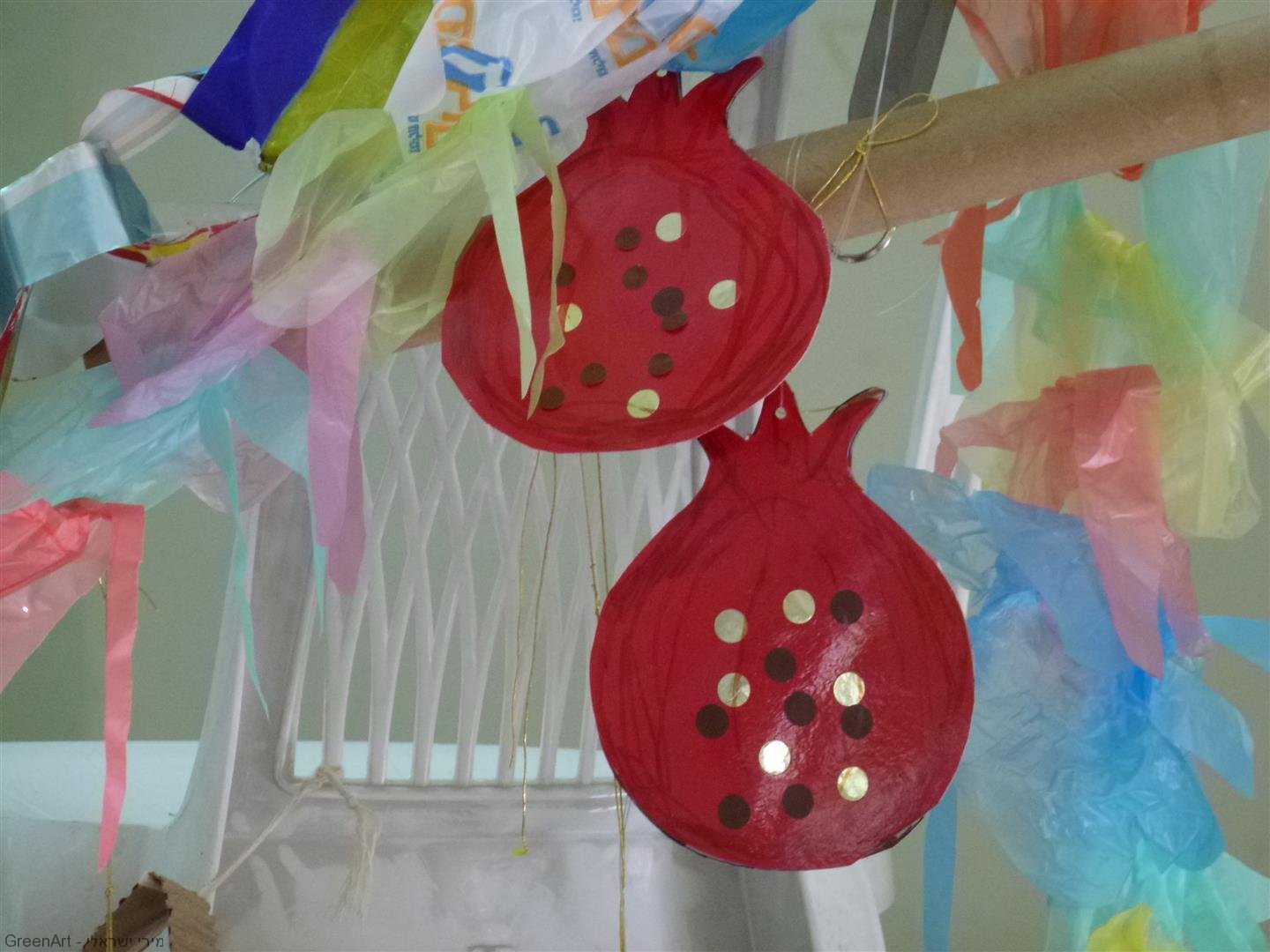 נשארו לכם תחתיות של מגשי קלקר מאריזות של ירקות, תוכלו לצייר עליהם עם טוש את ארבעת המינים או רימון שהכנתי לצורך המובייל. אחרי ציור הרימון על גבי מגשית הקלקר,יש לגזור את צורת הרימון ולהדביק עליו שאריות של ניר אריזה בגוונים אדומים משני צידי הרימון. ניתן להדביק מדבקות אדומות להבלטת גרעיני הרימון וקבלנו רימון אדום ויפה המוכן לתליה. אפשרות נוספת היא לקחת תקליטור להדביק עליו נייר אריזה בגוונים אדומים המצויר כפול להדבקה על שני צידי התקליטור לקבלת רימון. להכין מניירות צבעוניים קיפולים של אקורדיון בערך כ 5 דפים, מחברים את כל הדפים המקופלים ליצירת מניפה עגולה ומדביקים את הקצוות. תולים את הרימונים עם חוט דייג למניפה ומקבלים קישוט מרהיב צבעוני ויפה לסוכה והכל מחומרים ממוחזרים שיש בכל בית.
