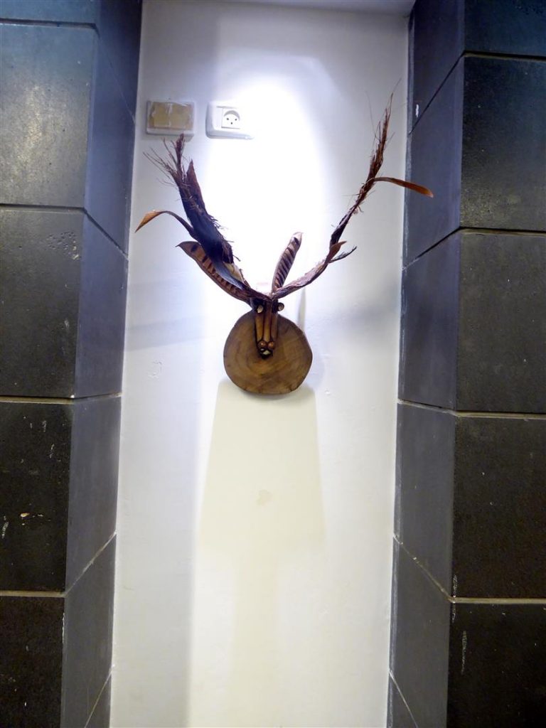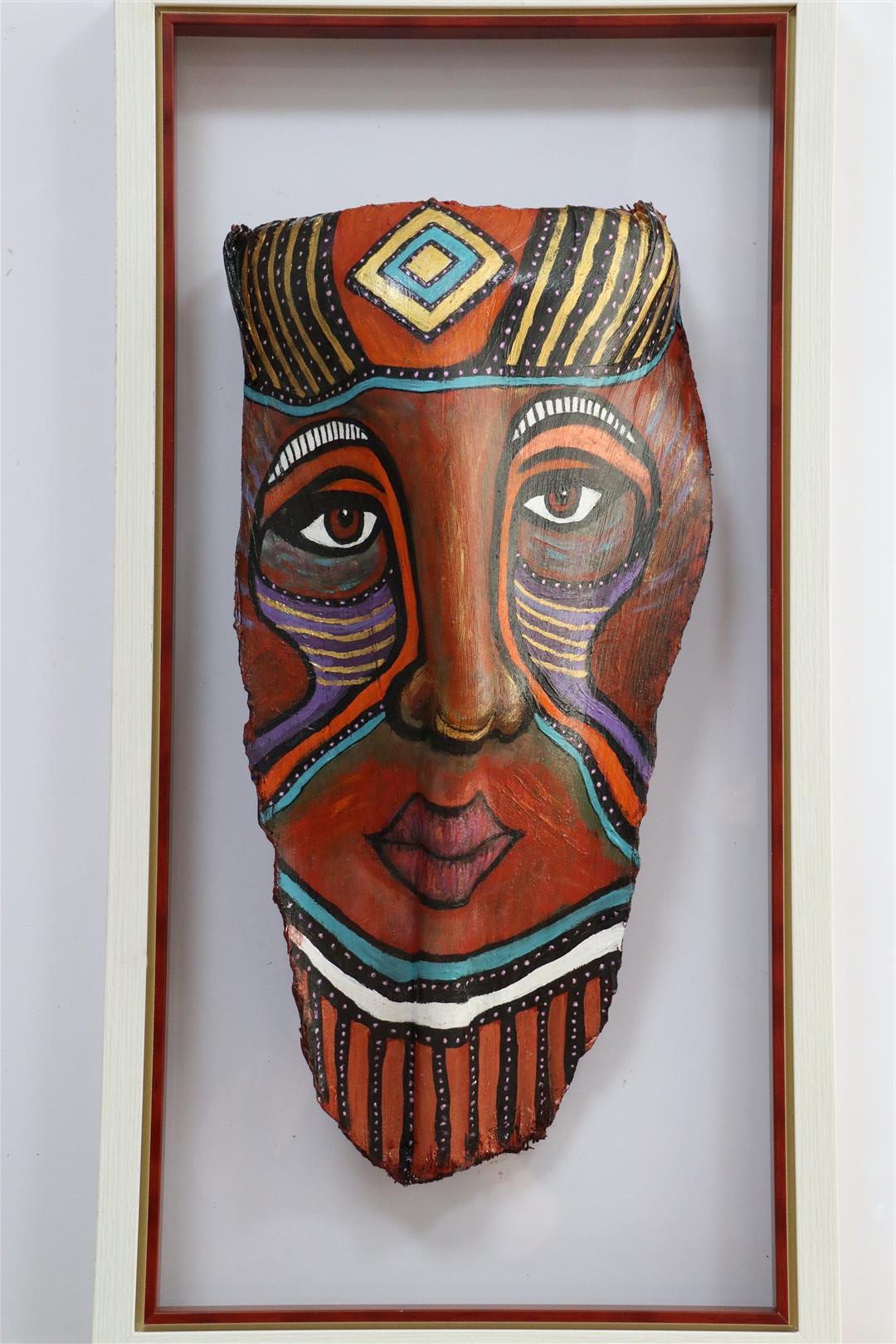"מסכה אפריקאית" – ציור על ענף דקל ישן שנאסף מן השדה נטוש ורטוב והפך לאמנות אקולוגית.