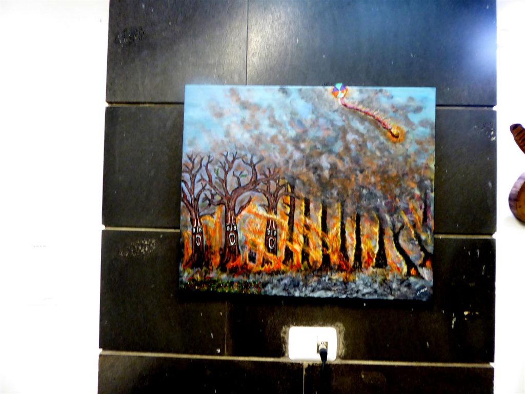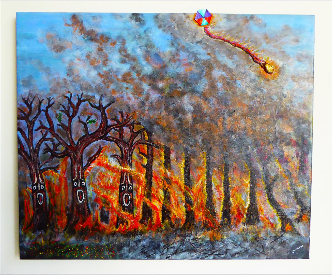 "יער התבערה" – ציור שיצרתי כזעקת העצים נגד טרור העפיפונים המגיע מגבול עזה ליישובי העוטף ומכלה לנו את היערות והשדות. להשמיע את זעקת העצים הנשרפים ביישוביי עוטף עזה – והפגיעה הקשה באדם, בטבע ובזיהום האוויר.