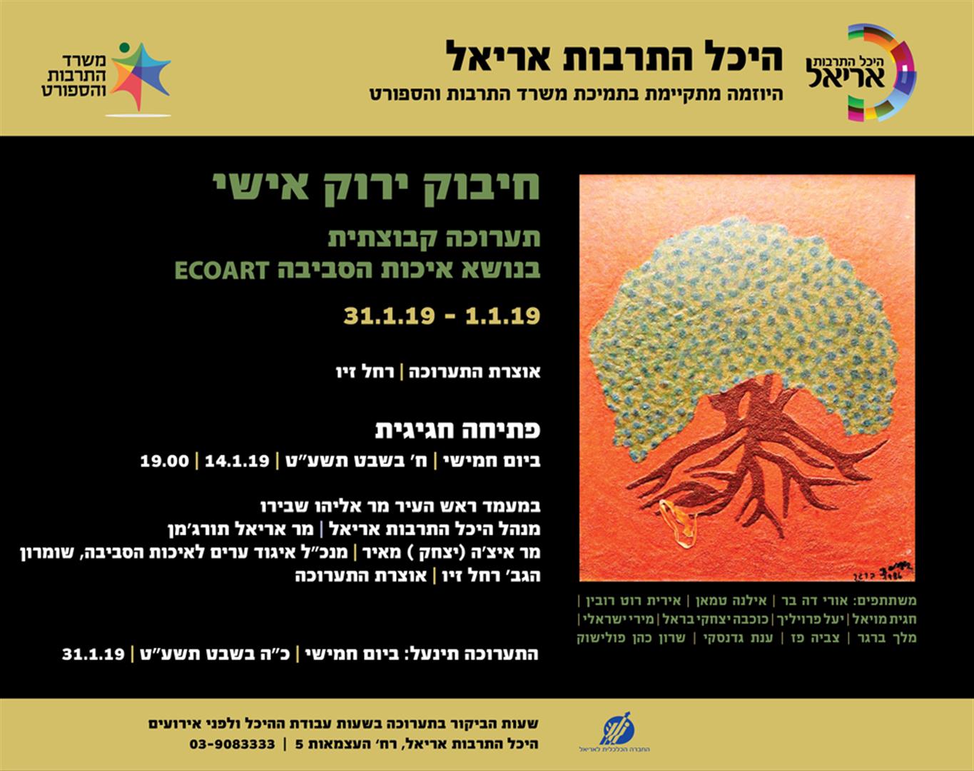 מוזמנים לבקר אותנו בתערוכה הקבוצתית "חיבוק ירוק אישי" עם האוצרת רחל זיו הנוגעת בנושא שימור הטבע ואיכות הסביבה.