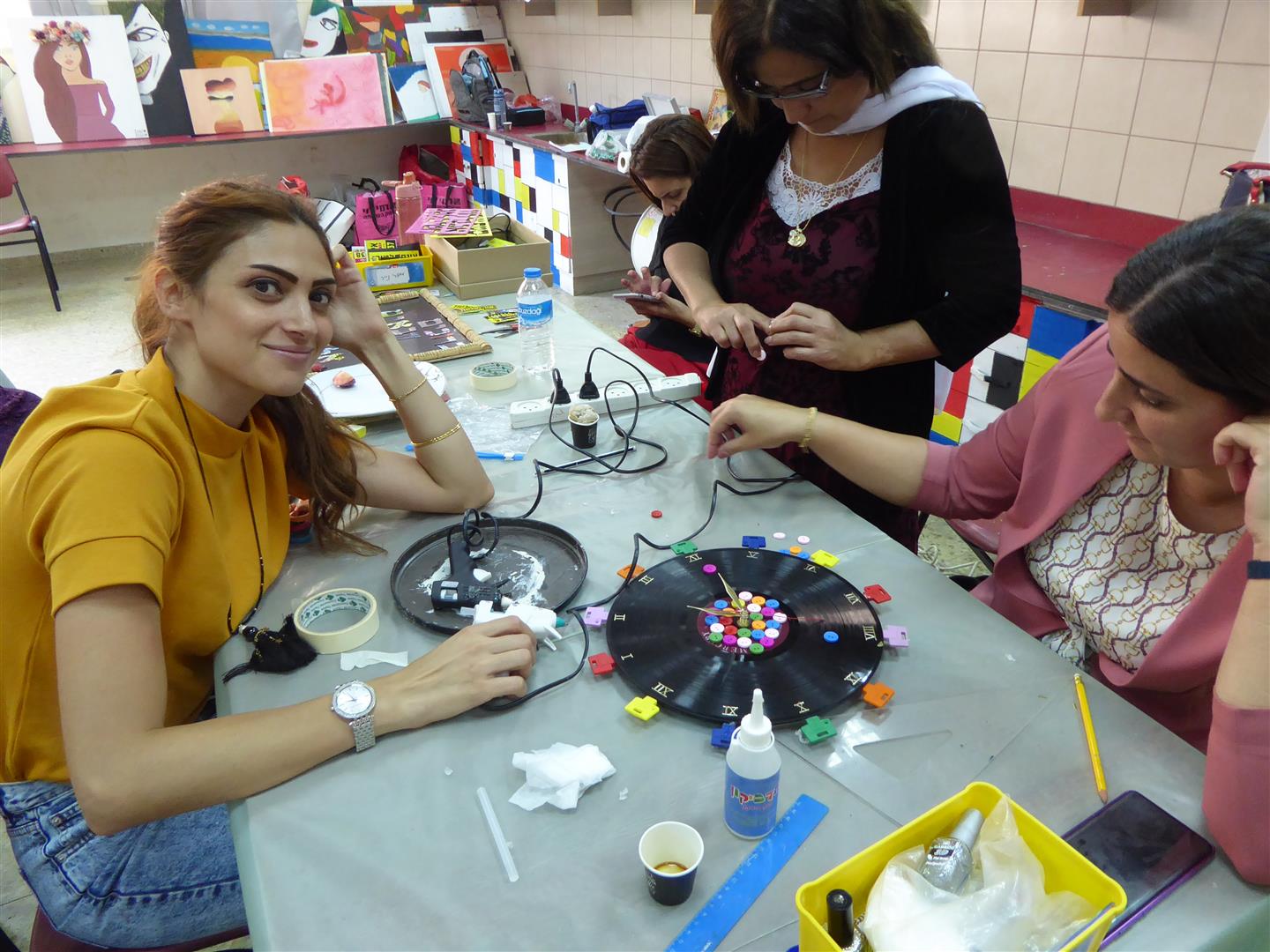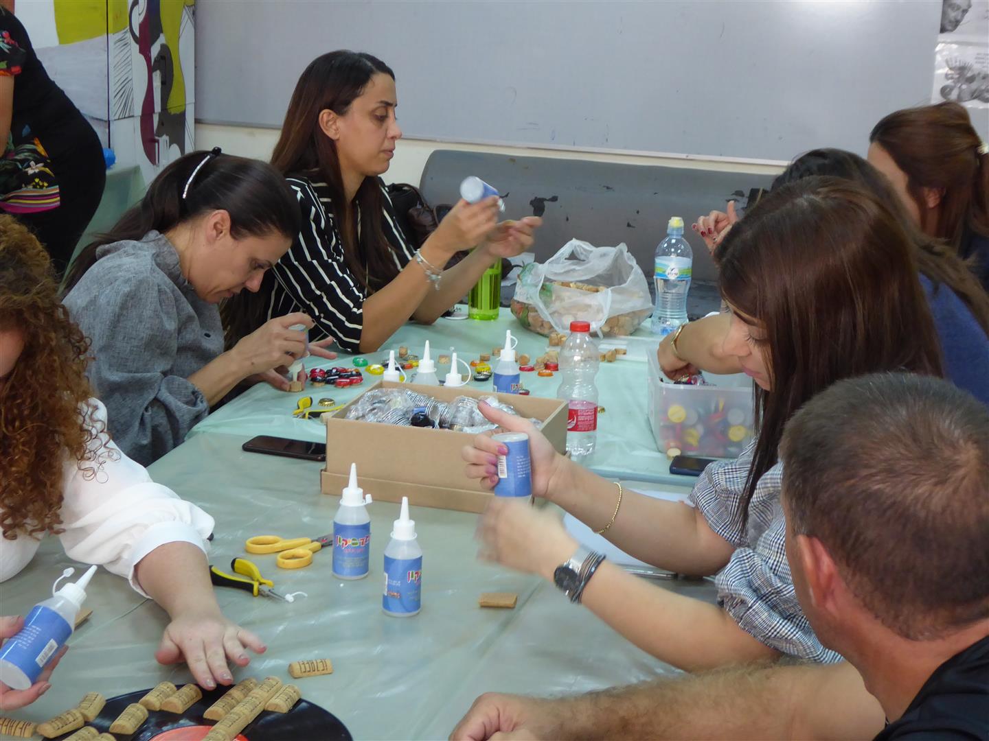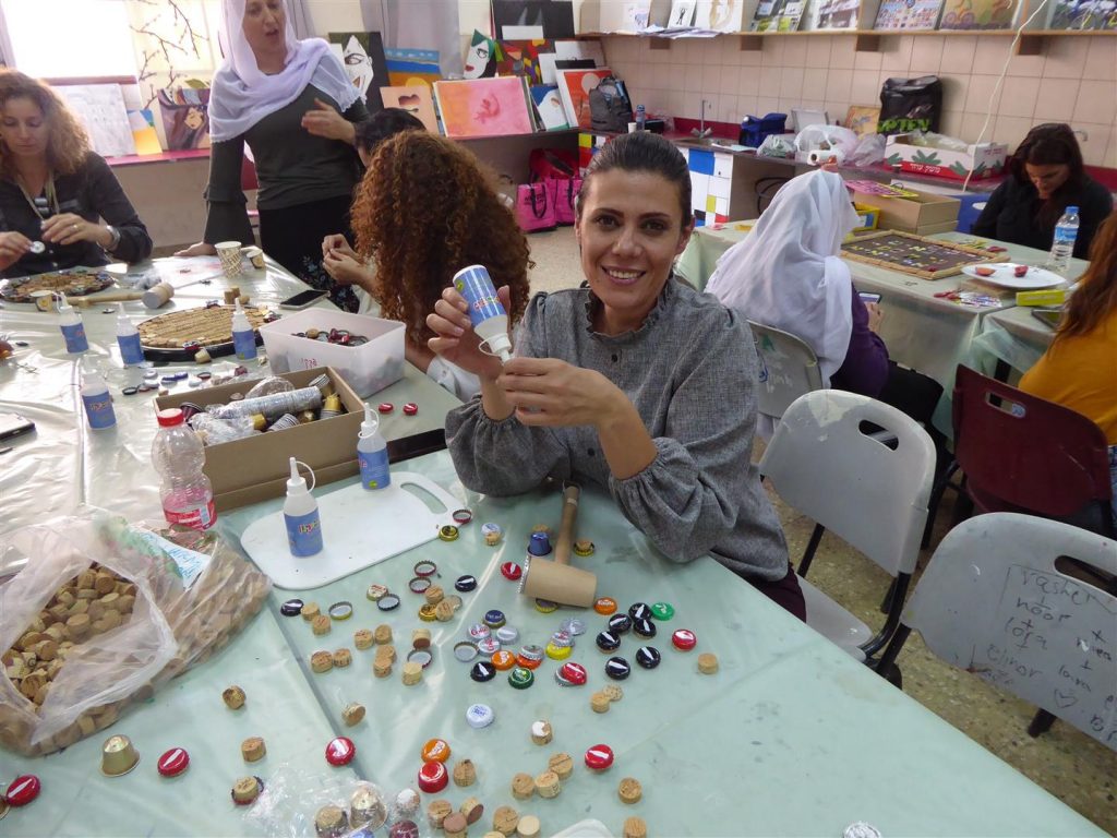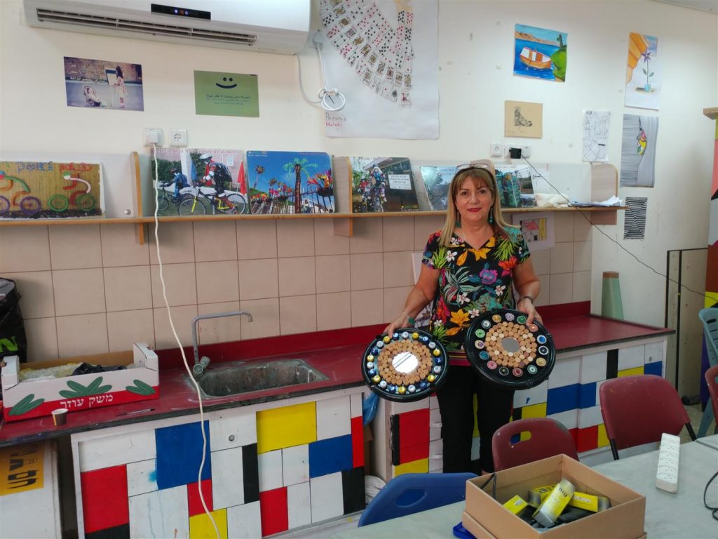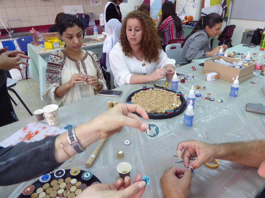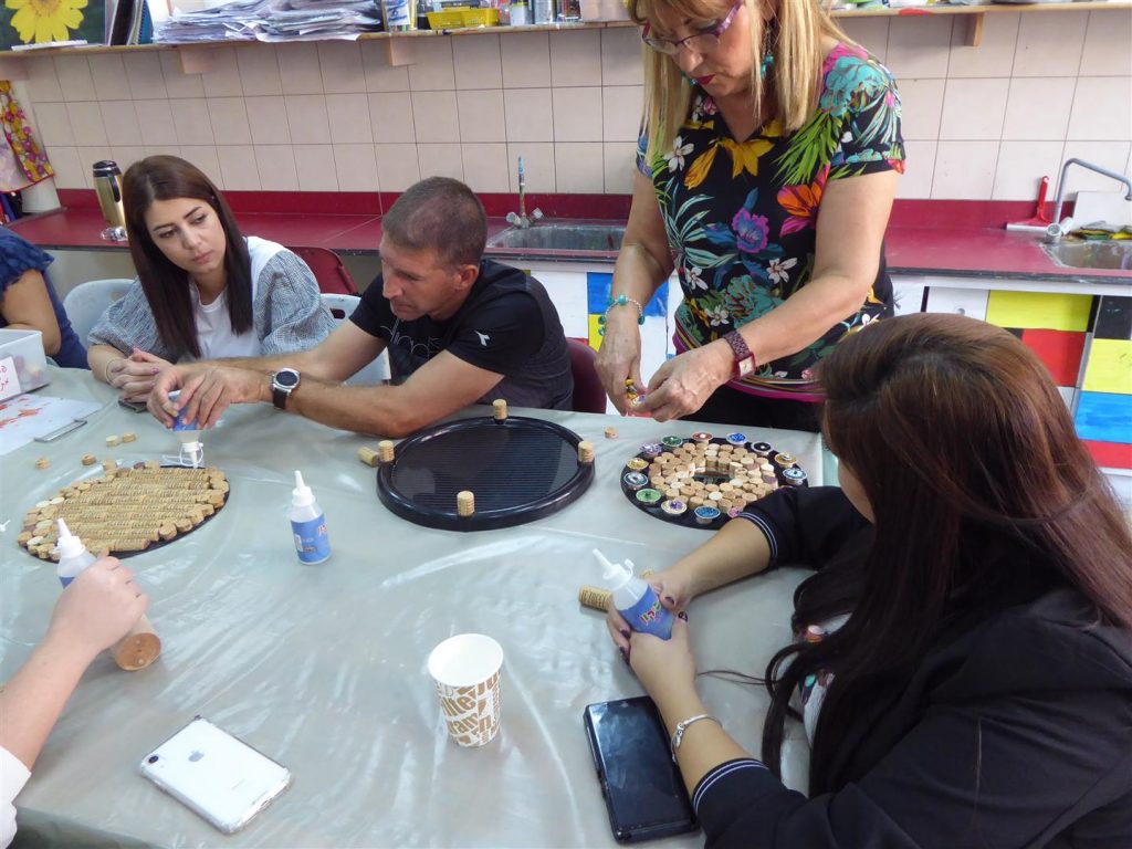 במפגש נוסף הדרכתי את המורים שביקשו ליצור בחדוות היצירה הירוקה – כיצד ניתן לעצב את חדר המורים מחומרי פסולת שהייתה בדרכה לפח ועברה מהפך. המורים חוו כיצד להתייחס לפסולת במקום כמטרד סביבתי, ללמוד להשתמש בה שוב כמשאב יקר ערך, ככלי לצמצום הצריכה, ככלי לפיתוח חשיבה יצירתית מחוץ לקופסה וכמשאב כלכלי, חינוכי ויצירתי.