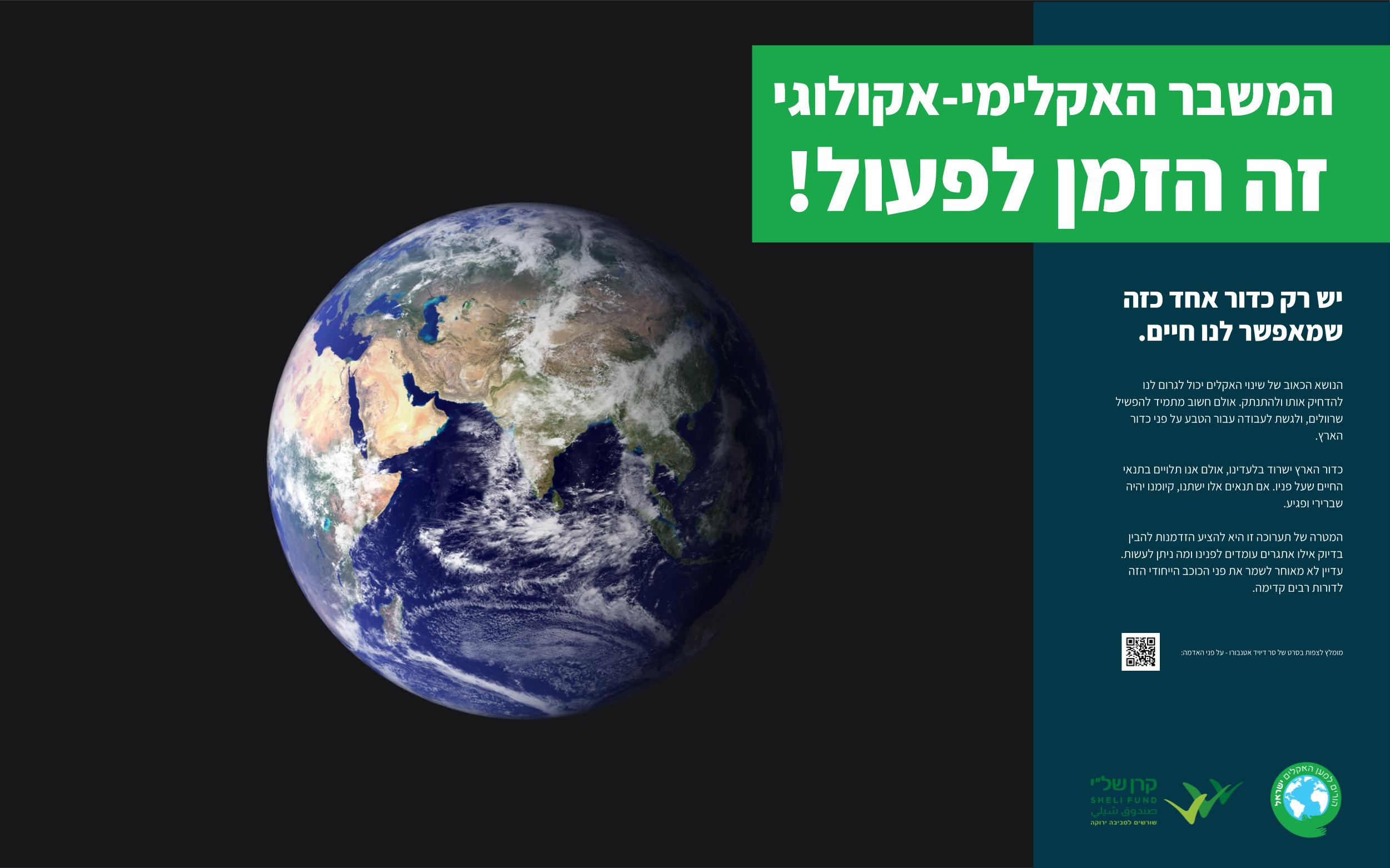 אנו נמצאים במצב חירום אקלימי,  לפי כך, החלטנו חברי תנועת "הורים למען האקלים" ליצור תערוכת פוסטרים הפתוחה לציבור הרחב, העוסקת במשבר האקלימי-אקולוגי, שההסבר בפוסטרים מתורגם מעברית לאנגלית וערבית.  במטרה לקרוא למבקרים ולמקבלי ההחלטות, לפעול דחוף לעתיד האקלימי ואקולוגי כי-